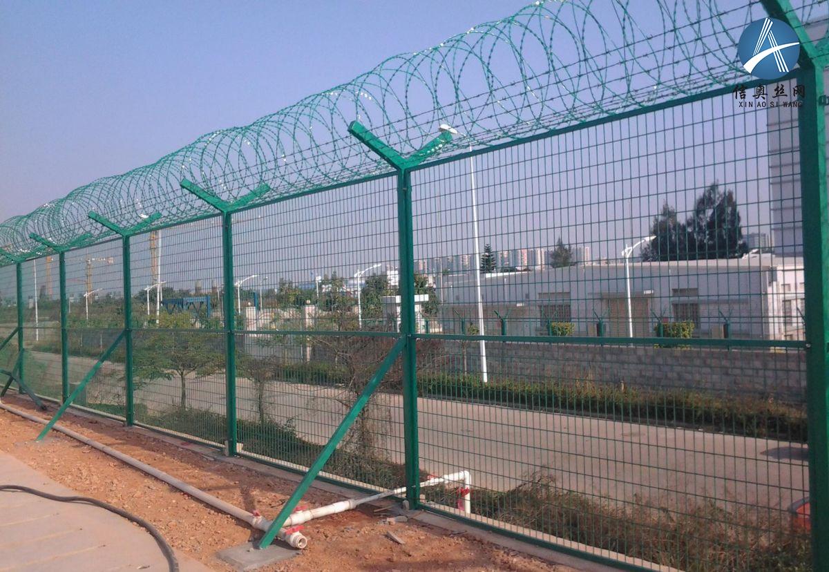 機場圍欄產品采用熱浸鍍鋅和靜電噴涂,采用國際流行的ral顏色的優質聚酯粉末。特點:如果在機場護欄頂部安裝刀片刺鐵絲和刀片刺繩,安全防護性能得到很好的提高。采用電鍍、熱鍍、噴塑、浸漬等防腐形式。它具有良好的抗老化、防曬和耐候特性。其產品造型美觀,色彩多樣,既能起到圍欄的作用,又能美化環境。由于其高安全性和良好的防攀爬能力,網狀連接采用特殊的SBS緊固件,有效防止人為破壞性拆卸。四個橫向彎曲加勁肋顯著增加了網格強度。